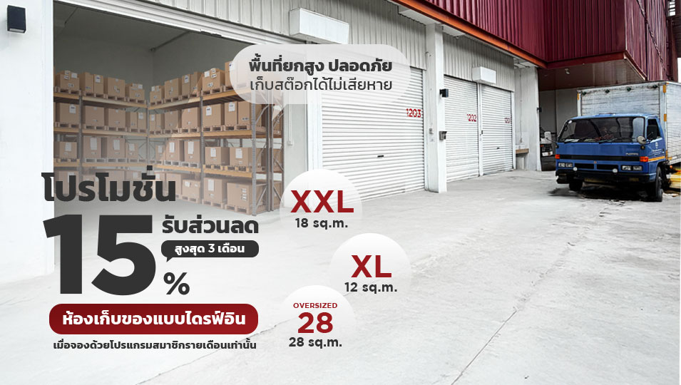 รับส่วนลด 15% สำหรับห้องเก็บของ Drive-in ขนาด XL (12 ตร.ม.) XXL (18 ตร.ม.) หรือ Oversized 28 (28 ตร.ม.) นานสูงสุด 3 เดือน